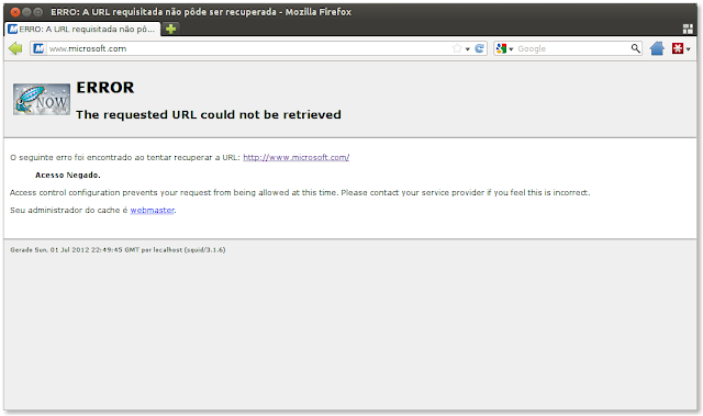 Após a configuração acesse algum site e perceba que irá conseguir navegar sem problemas, mas ao tentar acessar um site bloqueado ou que contenha uma palavra bloqueada em seu endereço você irá se deparar com uma mensagem de acesso negado como o da imagem abaixo.