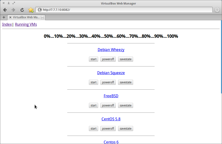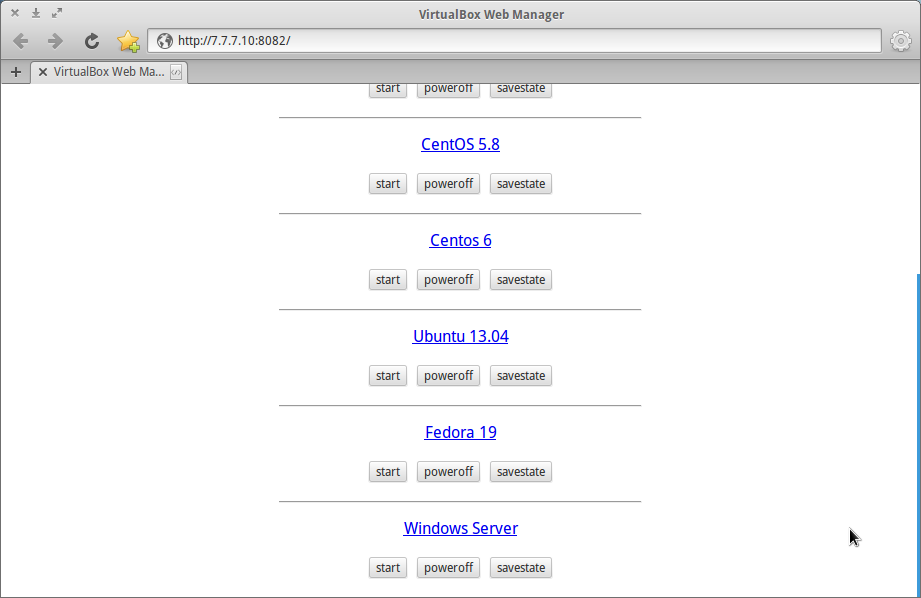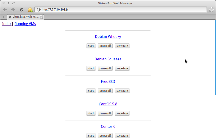 Como tenho preguiça de ter que ir até ele toda hora para realizar alguma ação no virtualbox e o mesmo possuí o python instalado, resolvi criar uma simples aplicação web com python3 e bottle para manipular o virtualbox do meu antigo pc pelo navegador, para pelo menos iniciar e salvar o estado da VM.