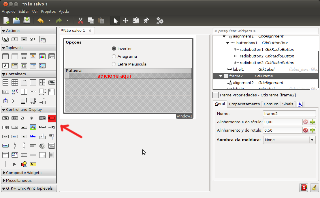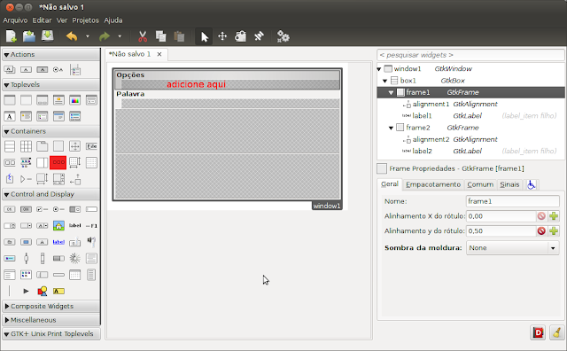 Continuando a criação da interface, agora adicione um GtkEntry no GtkFrame Palavra