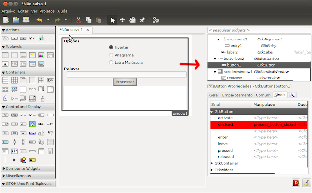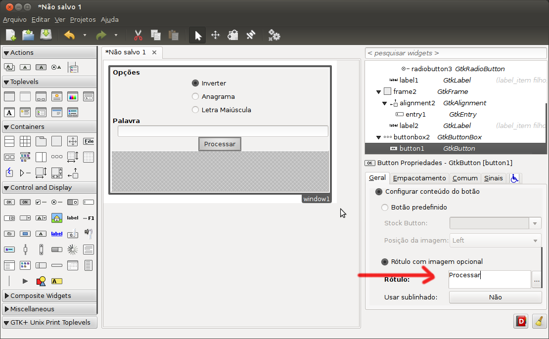 Na aba Geral do novo GtkButton altere o campo Rótulo para Processar