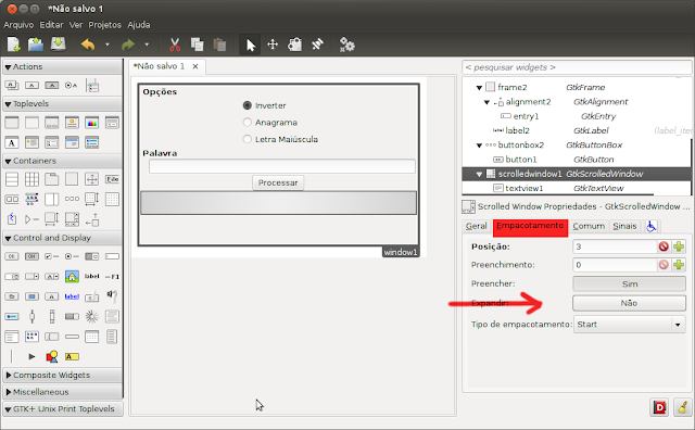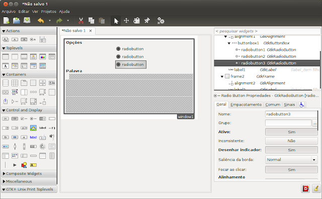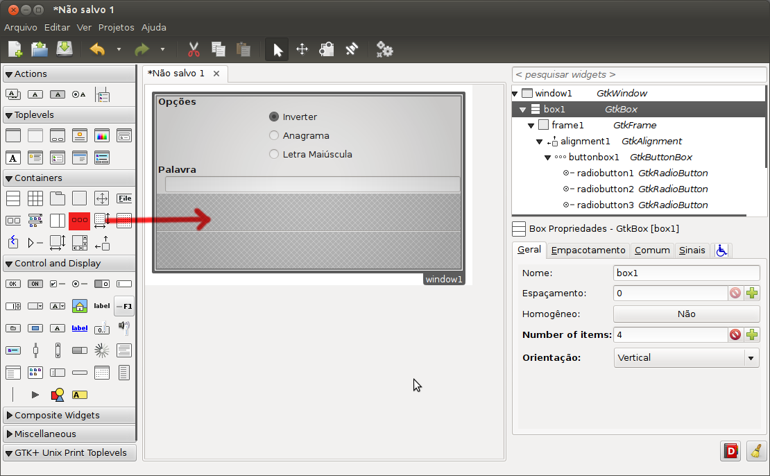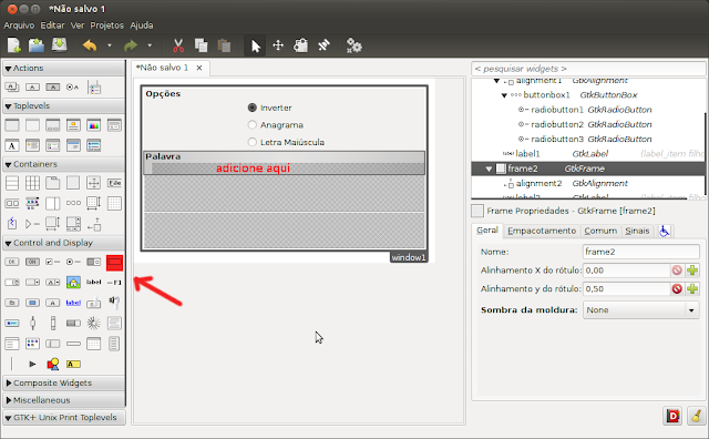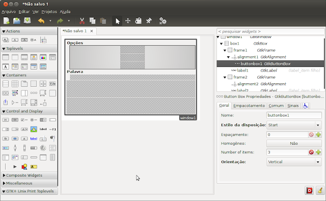 Agora vamos adicionar um GtkButtonBox com 3 campos no frame Opções que irá suportar os radio buttons, adicione no centro do frame onde está vazio conforme imagem abaixo