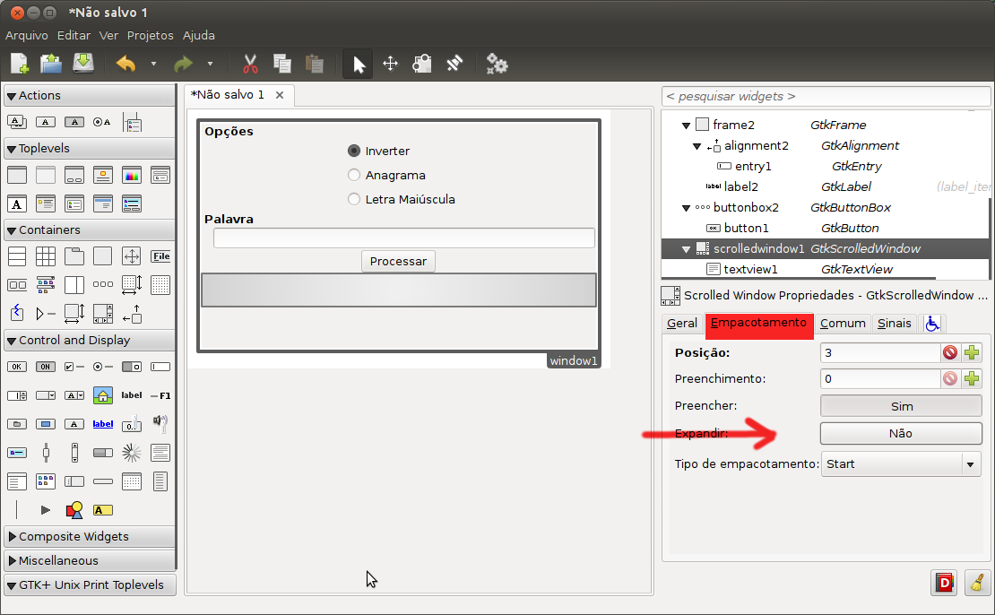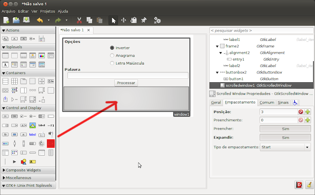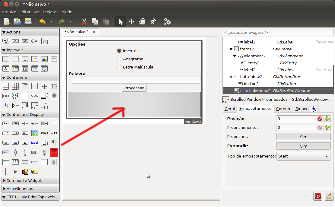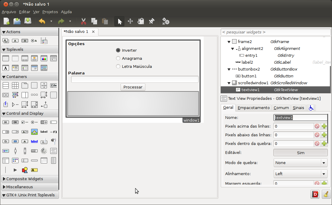 Dentro do GtkScrolledWindow insira o GtkTextView que será utilizado para exibir a palavra modificada
