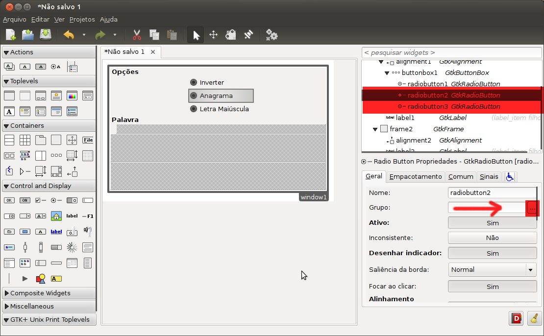 Devemos adicionar apenas os botões desativados ao grupo do botão pai que será o grupo em si, nesse caso iremos definir o radio button com o rótulo de Inverter como grupo logo não iremos mexer nele e sim nos outros botões restantes Anagrama e Letra Maiúscula.
