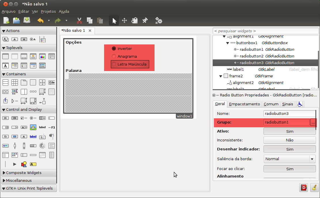Na aba geral desses botões clique na opção Grupo e na janela que abrir selecione o botão pai (radiobutton1 - Inverter) e clique em ok, faça este procedimento com o radio button Anagrama e Letra Maiúscula.