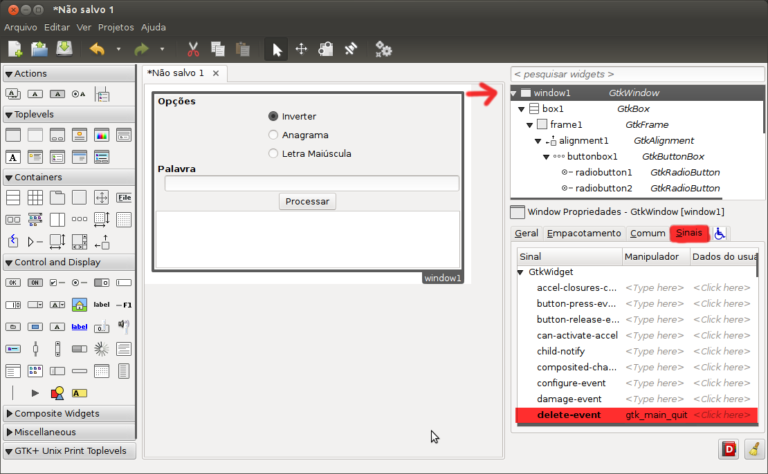Agora para finalizar a criação da interface, vamos configurar os siginals necessários que serão apenas dois, o signal delete-event do widget da nossa janela principal que serve para finalizar o programa e o signal clicked do botão Processar que irá chamar uma função do código python e executar os procedimentos necessários.